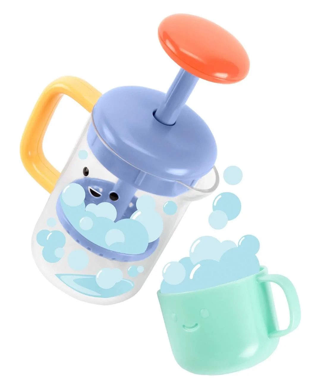 The SkipHop Tub To Table Cafe French Press bath toy set transforms bath time into imaginative café play. Featuring a working French press that creates bubbles when the plunger is pushed, the set includes cups and coffee pods for interactive fun.